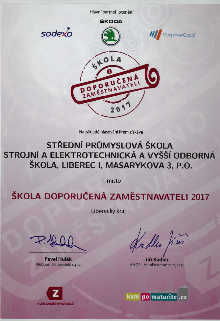 SPŠSE a VOŠ Liberec opět získala ocenění "Škola doporučená zaměstanavateli 2017".