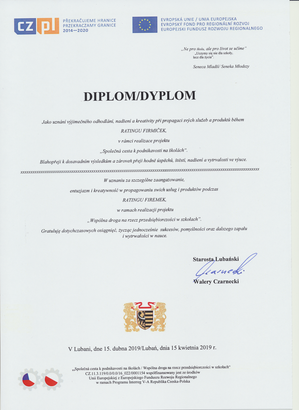 Dne 15.4.2019 naši studenti prezentovali své firmičky Krabit tools (nástrojárna), IPM (vstřikovna plastů) a Avemo (truhlárna) v polské Lubani. Právě Krabit tools se svojí segmentovou ohýbačkou plechů získal ocenění - 1.místo od komise polských podnikatelů a starosty města Lubaně.