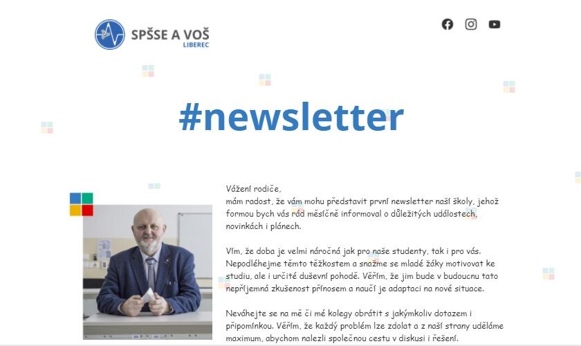 rádi bychom vám představili první newsletter naší průmyslové školy, který jsme vám právě zaslali na vaše e-mailové adresy. Touto formou bychom vás rádi měsíčně informovali o důležitých událostech, novinkách i plánech. Chceme vám být blíže a upevnit náš společný kontakt. Budeme rádi, pokud pro vás bude newsletter přínosný a rovněž oceníme vaši zpětnou vazbu, ať můžeme náš zpravodaj do dalších měsíců vylepšit dle vašich přání.