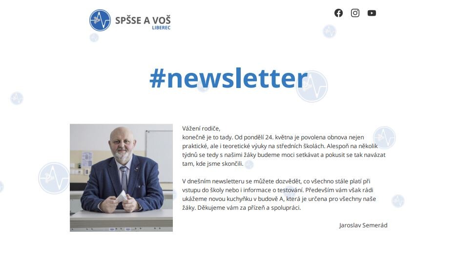 přinášíme vám v pořadí druhý newsletter naší průmyslové školy, který vám byl dnes doručen do vašich e-mailových schránek. Velmi vám děkujeme za pozitivní zpětnou vazbu u minulého vydání, která nás nabila energií a motivací pokračovat a zpravodaj zlepšovat.