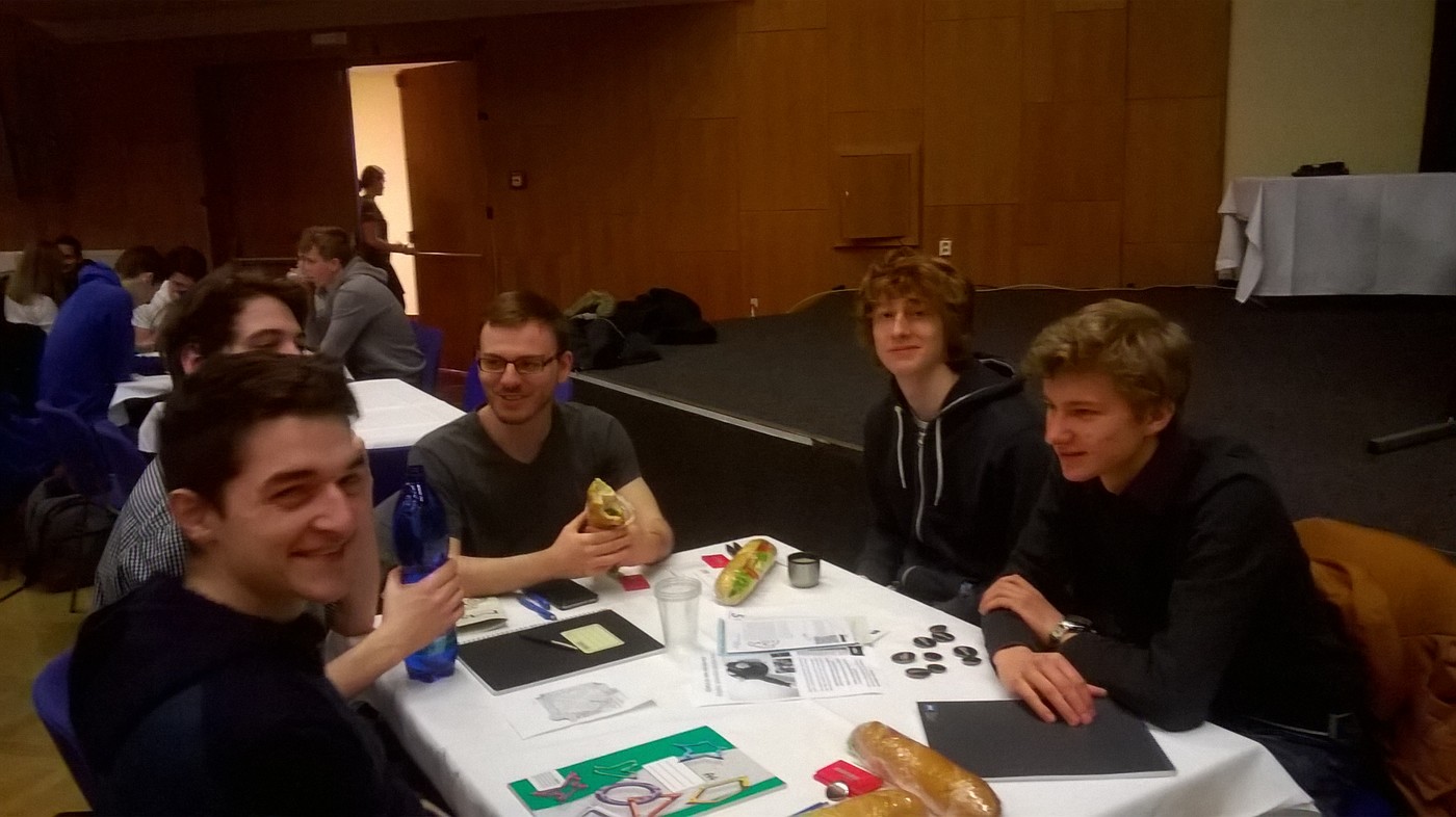 Ihned po příjezdu do Prahy jsme se dopravili přes celé město na Chodov, do TOP HOTELU, do místa konání soutěže. Po chvilce si naše skupina našla svůj stůl. Nervozita, která nás všechny držela, však hned opadla, jakmile naše geniální mozky viděly kelímky, bagety a láhve na pití. Pro odreagování jsme začali pomocí kelímků a lahví stavět majestátní věž.