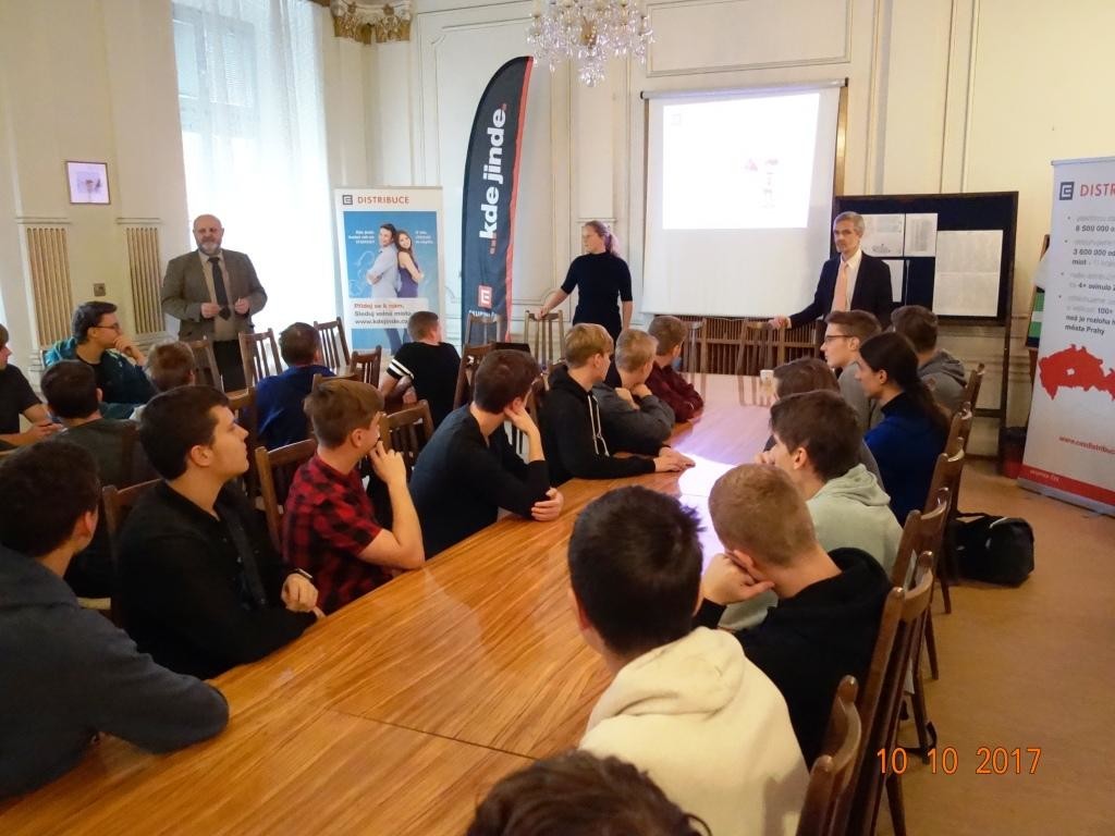 Zástupci ČEZ Distribuce a Asociace energetických managerů představili třídám E3B a E2B Motivační program Prokopa Diviše. Naše škola patří mezi podporované školy Skupiny ČEZ a nyní i mezi 10 středních škol ČR, ve kterých je tento program vyhlášen. Základem je velmi dobrý prospěch a docházka, bez kázeňských prohřešků. A k tomu něco navíc - účastnit se odborných akcí a soutěží, případně získat na nich slušné umístění. Dalším kladem je účast v programech Skupiny ČEZ (Energetická maturita ...). Odměna je velmi příjemná. Devět nejlepších žáků si rozdělí finanční částku v celkové hodnotě 100.000,- Kč. Velmi lákavá nabídka ...