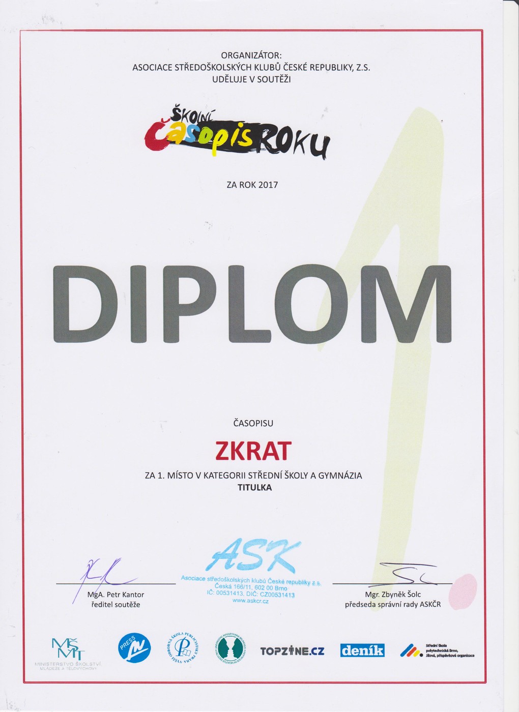 Po neuvěřitelném prvenství v Libereckém kraji, kde jsme se ZKRATem na plné čáře zvítězili, se naši studenti vypravili i na finále soutěže Školní časopis roku pro celostátní titul.
