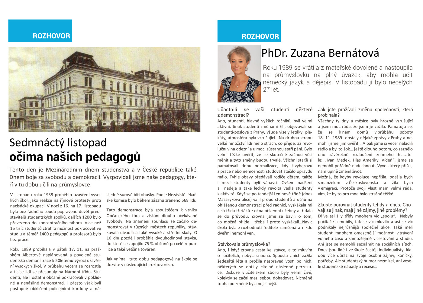 Tento rok jsme se jako vzpomínku na 17. listopadu 1989 rozhodli vyzpovídat 4 učitele "pamětníky", kteří tou dobou byli zaměstnanci školy a jsou jimi doteď – Zuzanu Bernátovou, Janu Douskovou, Evu Kirschnerovou a Stanislava Krotila. V následujících rohovorech se dozvíte, jak učitelé vnímali probíhající změny ve společnosti, jak se změnily učební osnovy nebo co si myslí o dnešních studentech.