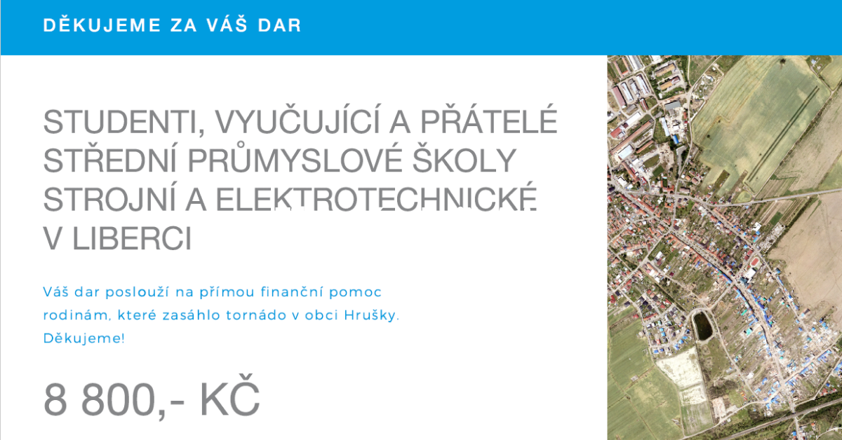 Dar jsme poslali na nadaci Diakonie Českobratrské církve, která pomáhá rodinám zasaženým tornádem v obci Hrušky. Devět nevládních organizací se dohodlo na koordinované pomoci tak, aby byly dary rozdělované spravedlivě a podle stejných pravidel. V první fázi chtějí co nejrychleji poskytnout 150 000 Kč každé z postižených domácností a ve druhé fázi pomoci těm, kteří se nemohou spolehnout na podporu rodiny, nemají dostatek úspor nebo je čekají nákladné opravy.